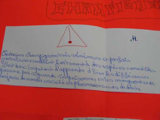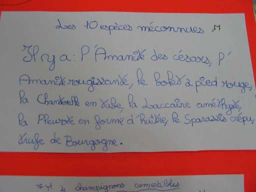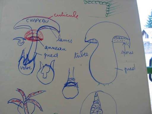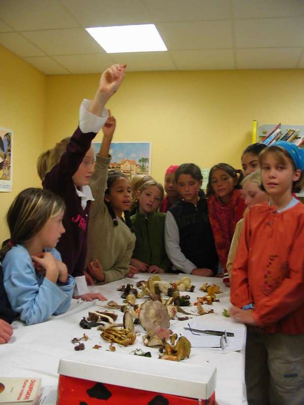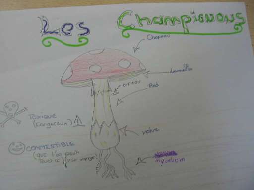 Grâce à Mme Vanzo, jeudi 14 octobre, Jean-Claude Blanc qui est un spécialiste de la société mycologique de Mâcon est venu nous voir pour tout nous expliquer sur les champignons. Il y avait plusieurs sortes de champignons : l'amanite tue-mouche, la trompette de la mort, le pied de mouton, le pied bleu, la clavaire élégante, la vesse de loup perlée. Les graines de champignons s'appellent les spores. Ce que nous ramassons ne sont pas des champignons mais des carpophores.