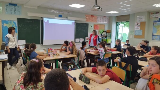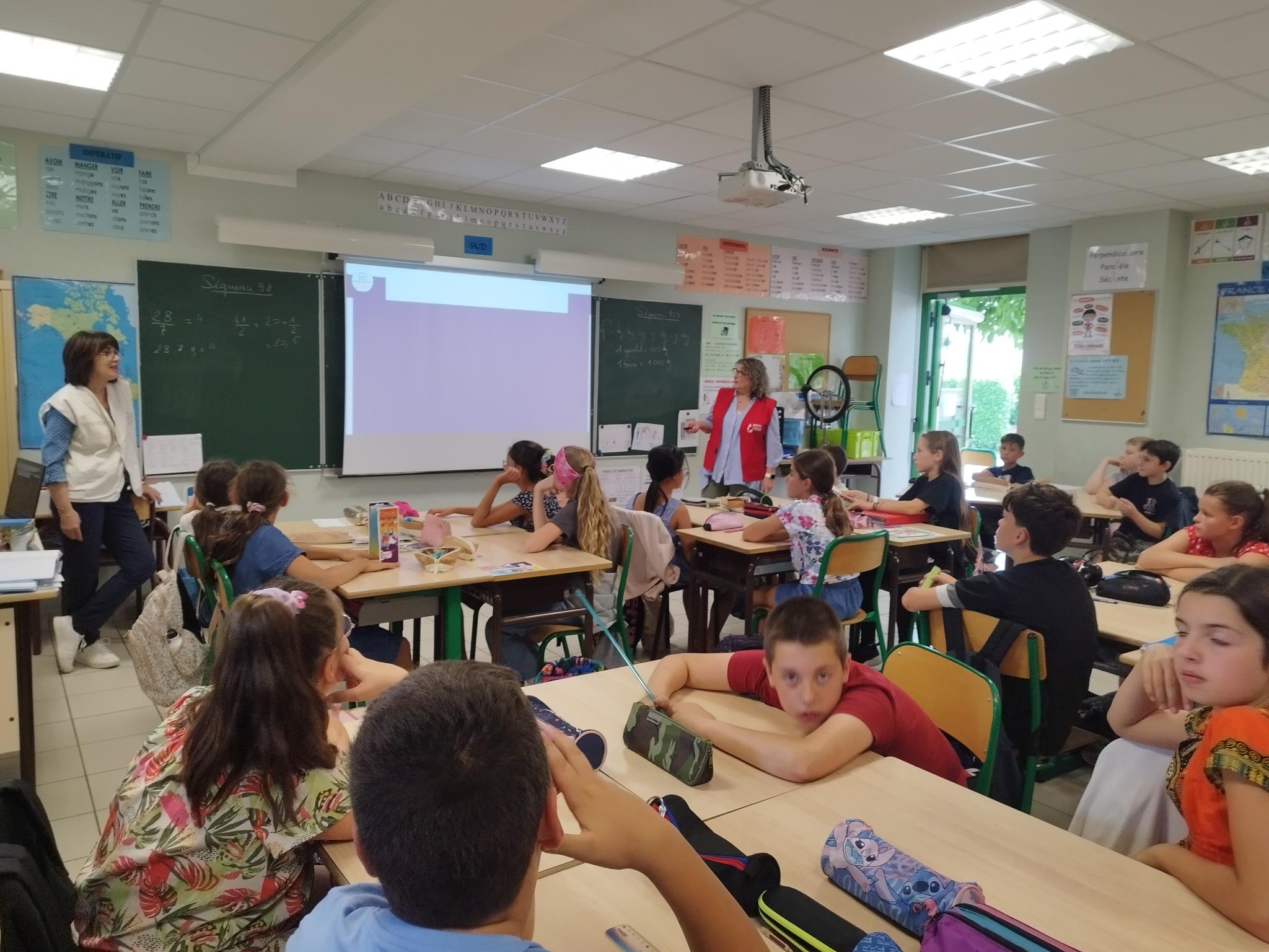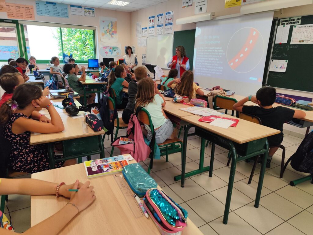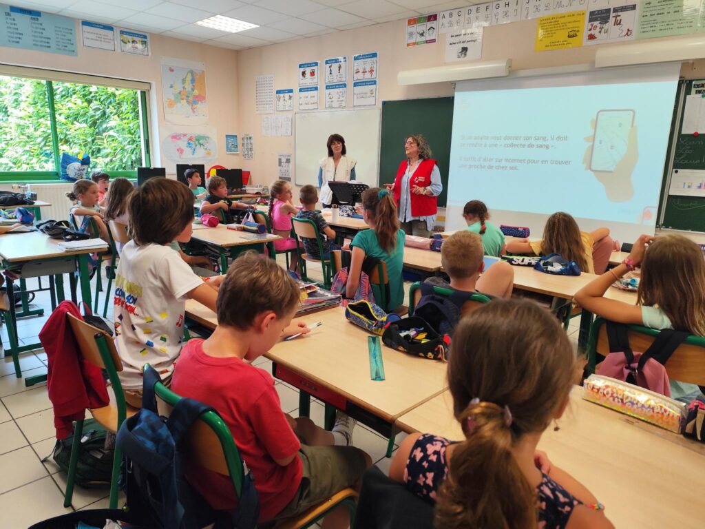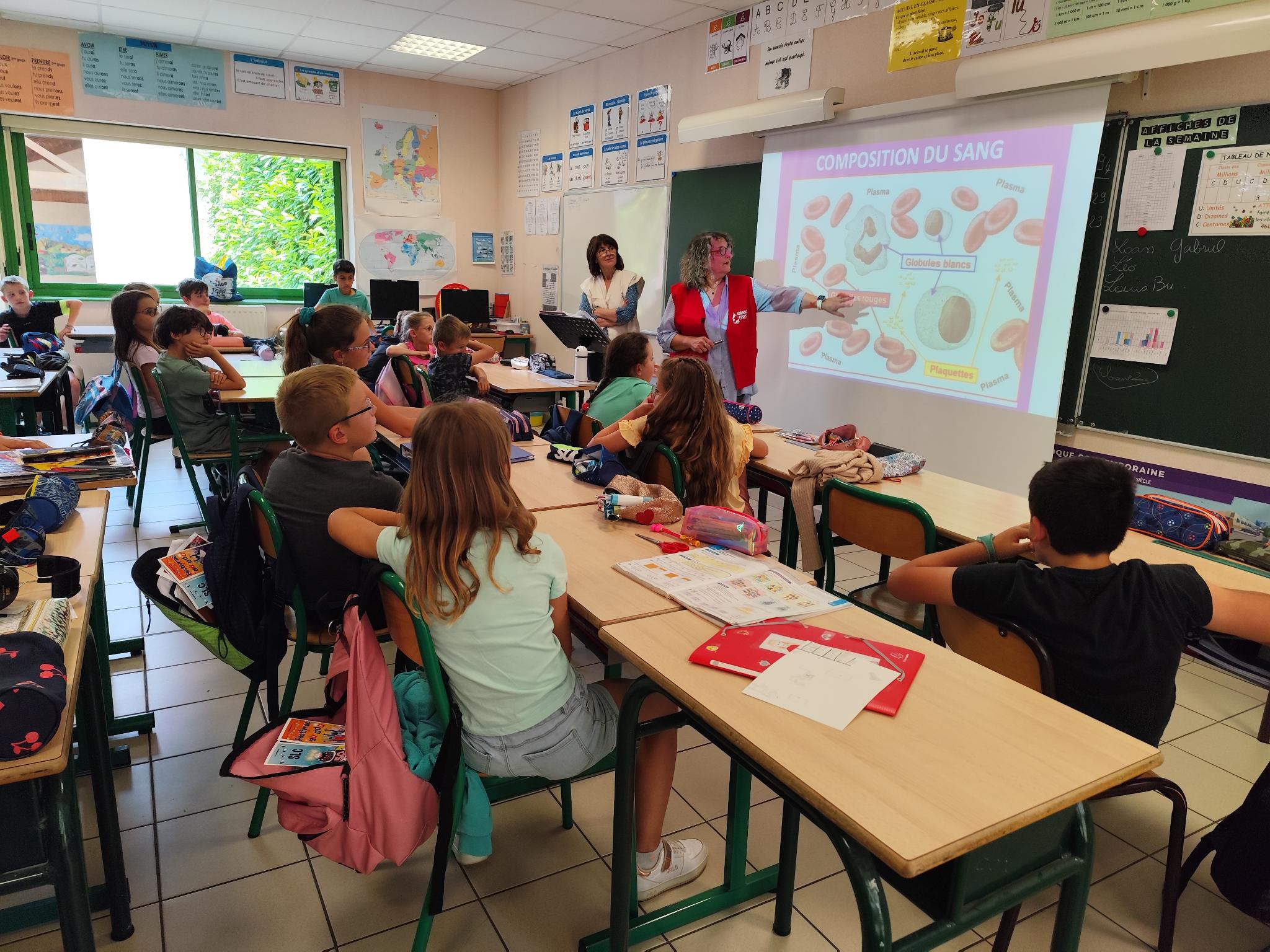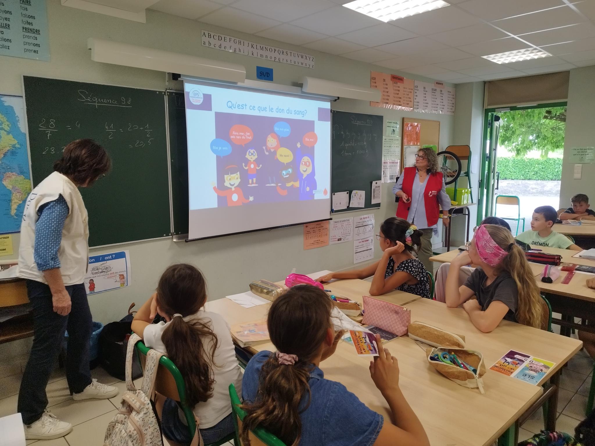 Ce mardi 10 juin, Béatrice Bodenan, présidente de l’Amicale locale des donneurs de sang accompagnée de Françoise PEDROLLO ont présenté aux enfants de CE2,  CM1 et CM2 le don du sang.