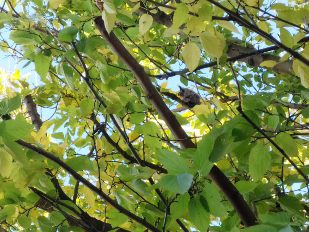 Cela fait des mois que l’on suspecte leur présence dans l’arbre de la cour en raison d’excréments et de pelotes de réjection au sol. Nous ne savions cependant pas qui et combien ils étaient…