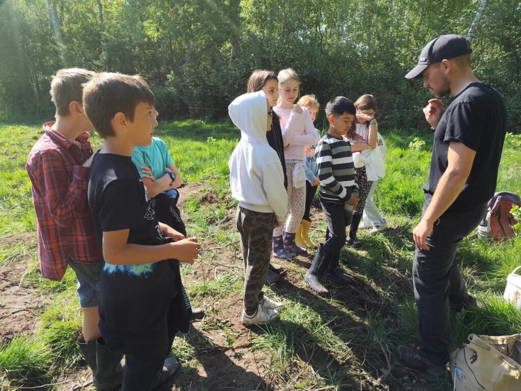 Nous avons fait un petit arrêt au jardin pédagogique de Boz. Là-bas, nous avons observé la mare avec les osiers tout autour, les hôtels à insectes et la grande bande de terre sur laquelle a été semée de la prairie fleurie.